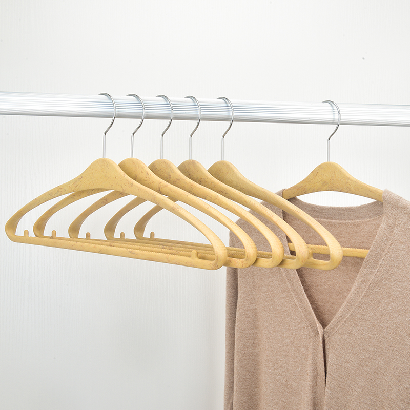 this plastic coat hanger is made of renewable plastic material with special wood looking.